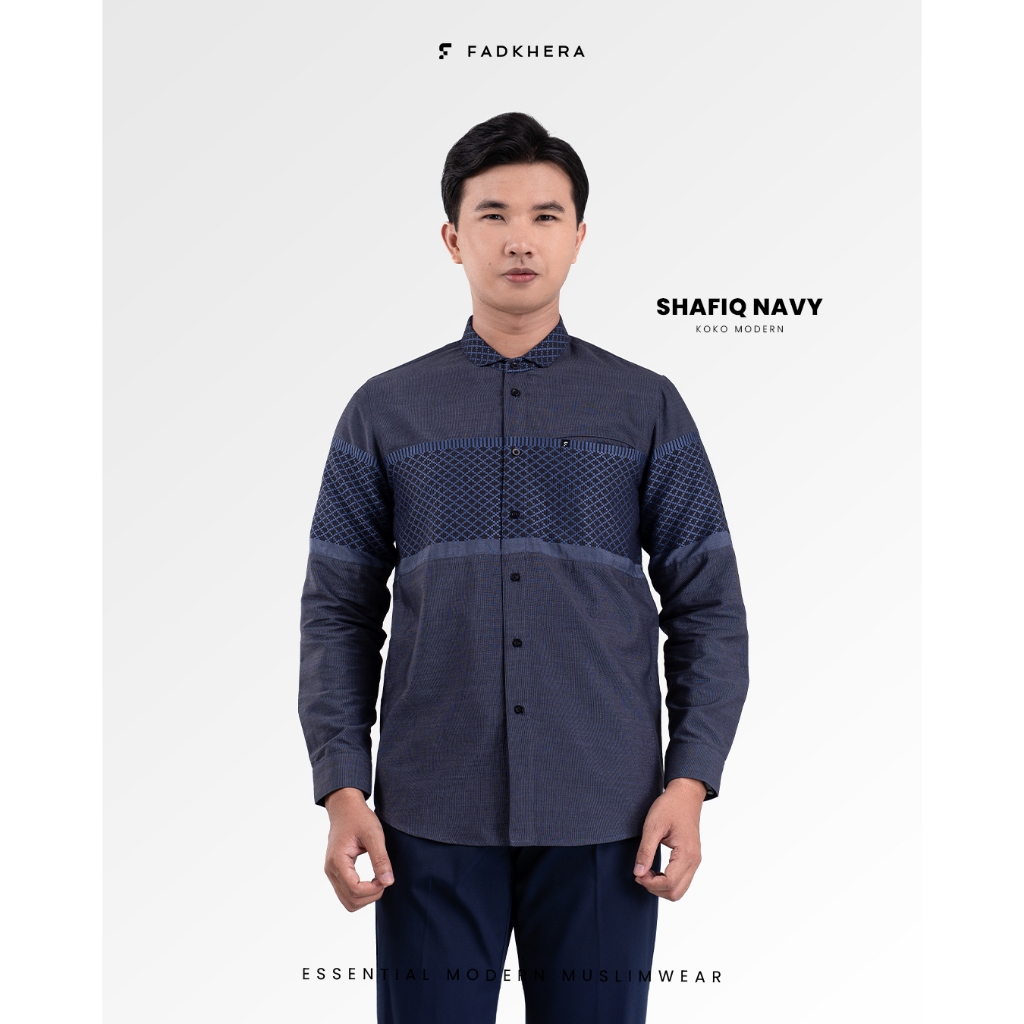 Fadkhera Shafiq Navy| Baju Koko Pria Modern Premium | Atasan Muslim Lengan Pendek Panjang