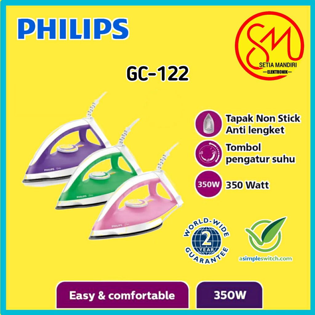 PHILIPS GC122 dan DST0510 Setrika Kering 350 Watt - Hijau Biru Pink dan Ungu Terjangkau