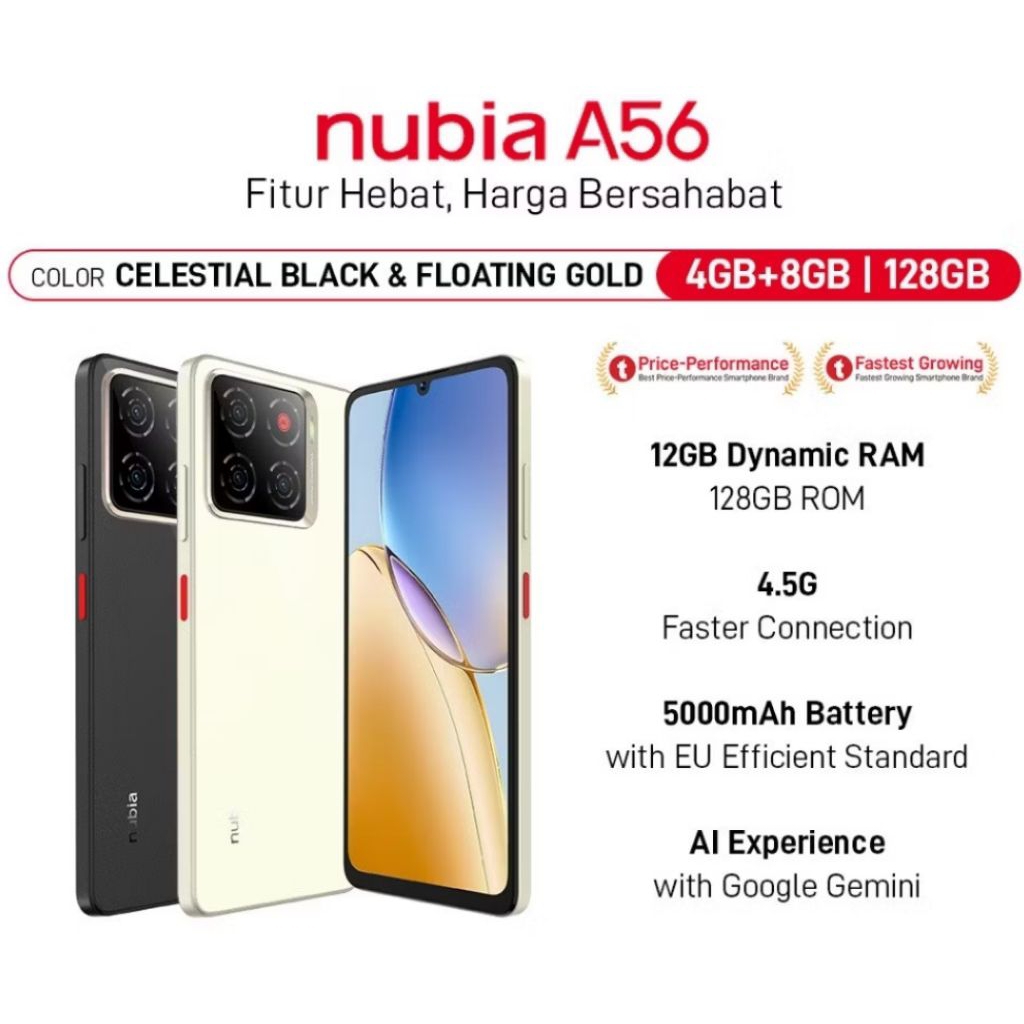Handphone nubia a56 4/128 Kamera AI 13MP Triple Camera Layar 6.75" 90Hz, Baterai 5000mAh Fast Charging