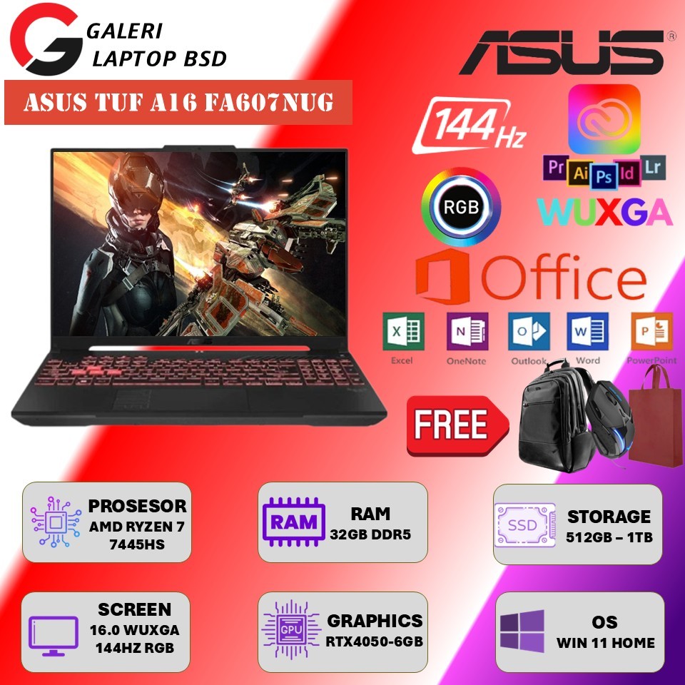 Laptop Asus Tuf Gaming A16 FA607NUG Amd Ryzen 7 7445HS Rtx4050 Ram 32GB DDR5 1TB Ssd Wuxga 144Hz Rgb Windows 11 Terbaru