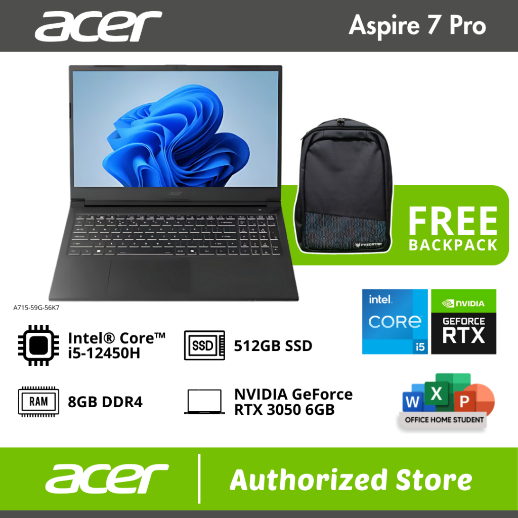ACER ASPIRE 7 Pro A715 59G 56K7 I5 12450H 8GB 512GB RTX3050 15.6" FHD 144Hz IPS W11 OHS24