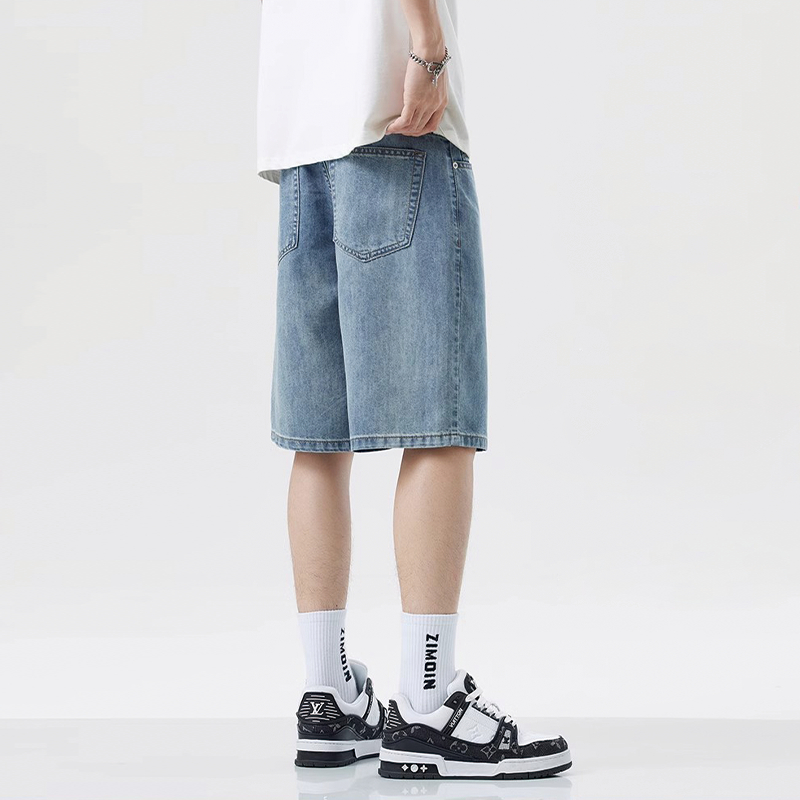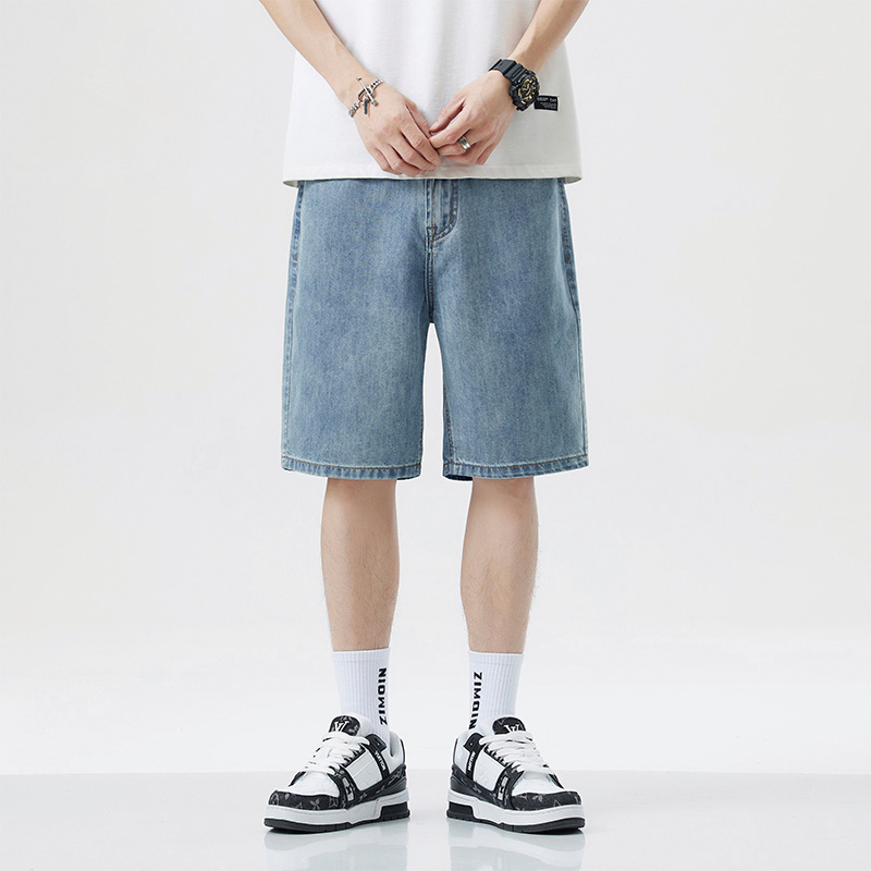Celana pendek pria biru baggy jeans premium denim Korean style gombrong unisex straight cut pants