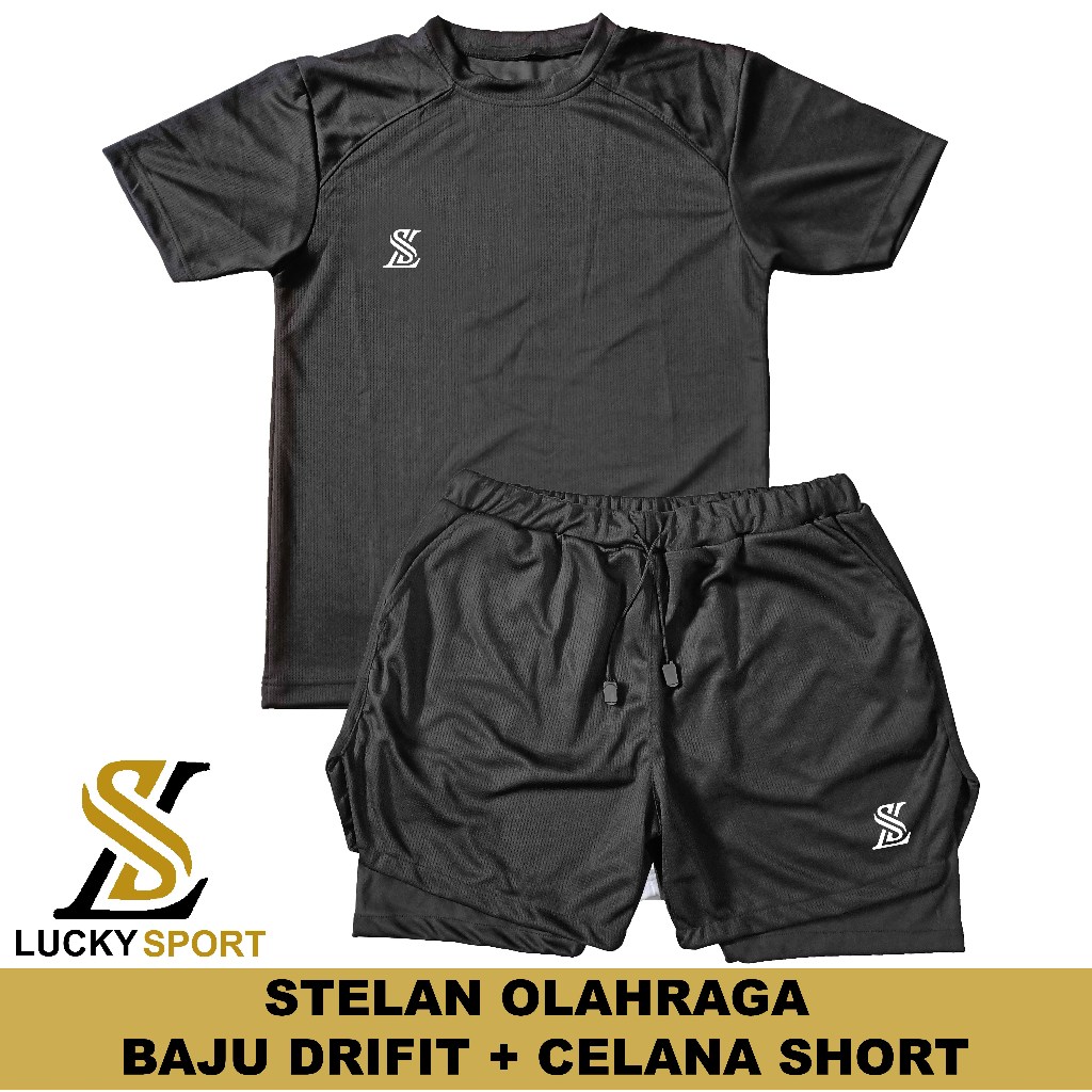Setelan Olahraga Pria Double Layer 1 Set Baju Kaos Dryfit Celana Pakaian Outdoor Running gym lari Badminton Volly Futsal