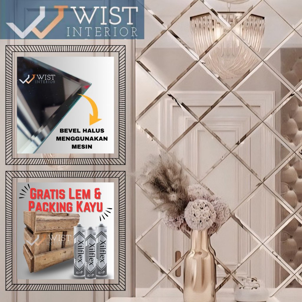 Cermin Dinding Bevel 5Mm Kaca Asli Premium Custom Ukuran Aesthetic Estetik Motif Wajik Diamond Ketupat Free Packing Peti