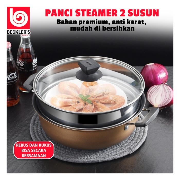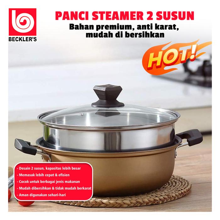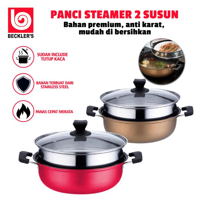 (Beckles's) Panci Kukus Stainless Steel Panci Sup Steamer Ikan Bakpao Siomay Dimsum 2 Susun - PX-05 Merah
