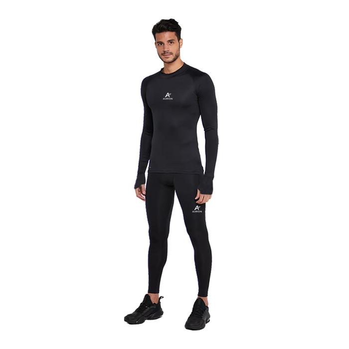AURION Setelan Manset Lengan Panjang dan Celana Baselayer Legging Olahraga Sepakbola Futsal Lari - Hitam S