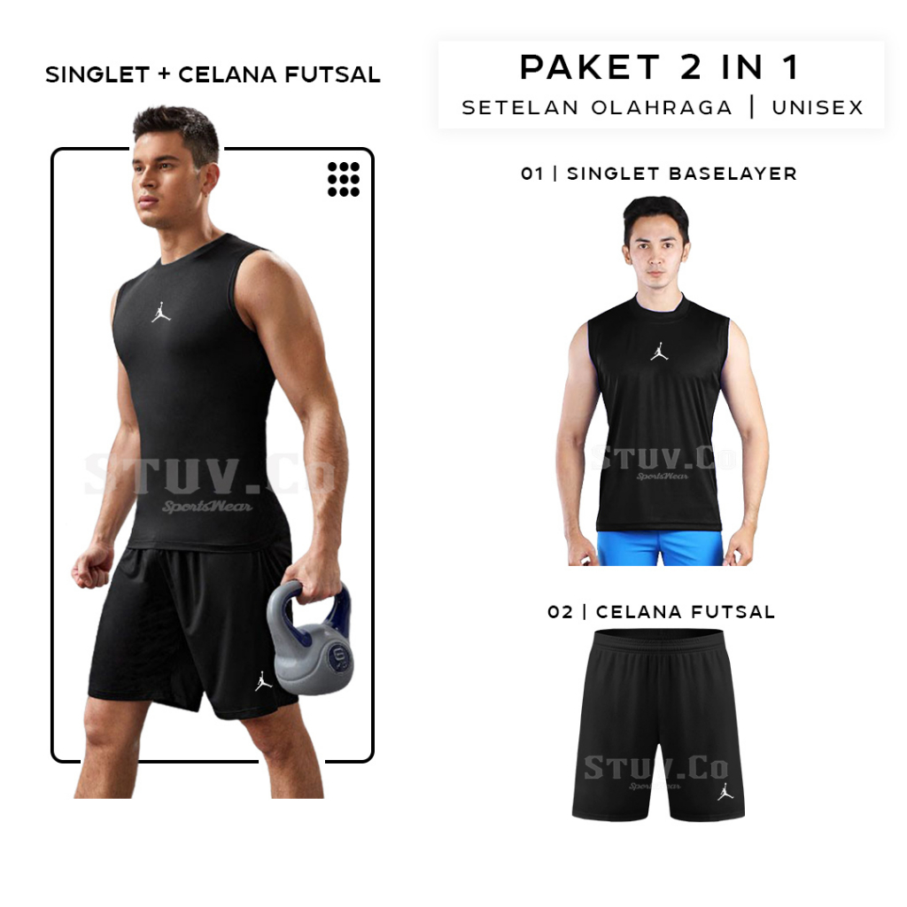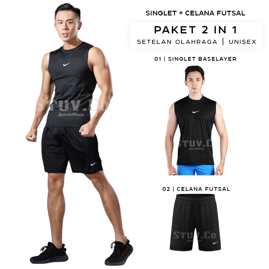 PAKET 2IN1 STELAN OLAHRAGA SINGLET BASELAYER SLEEVELESS DAN CELANA FUTSAL UNISEX
