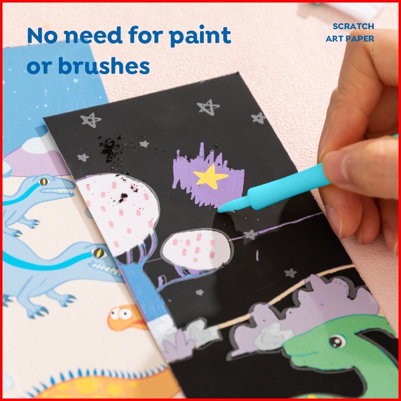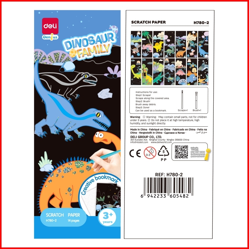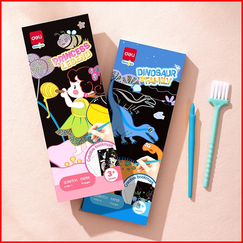 Deli Genius Magic Rainbow Scratch Paper Dinosaur Kertas Gores Berwarna 15 Pcs Pak Dino Gratis Scraper Dan Brush Eh780-2