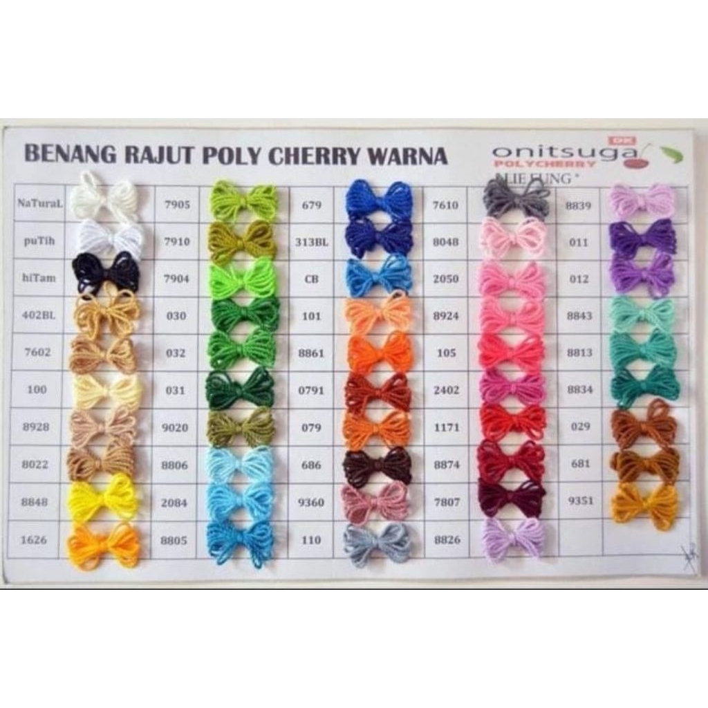 Putih, Natural, Krem (100), Gold muda (402BL), Coksu (7602), Salmon/salem (101), Oren (886), Kuning telor (1626), Mustard (9351), Coklat bata md (079), Coklat bata T (0791), Hijau kecoklat (681), Coklat sedang (029), Coklat Tua (686), Ungu kepink (8839), Ungu sedang (012), Ungu Tua (011), Baby Pink (8048), Pink Dusty (9360), Pink cerah (105), Magenta (2402), Biru muda (9088), Biru Tomy ( CB ), Biru BCA (079), Biru Navy (313 B L), Abu Tua (7610), Hijau 1 (Tosca), HIjau 2 (Stabilo), Hijau (7905), Hijau olive (7910), Hijau 5, Hijau daun (032), Hijau 7, HIjau botol (031), Merah hati (8874), Merah darah (1171), Merah maroon (7807), Hitam, Kuning 2 (8848), Pink sdg, Fanta