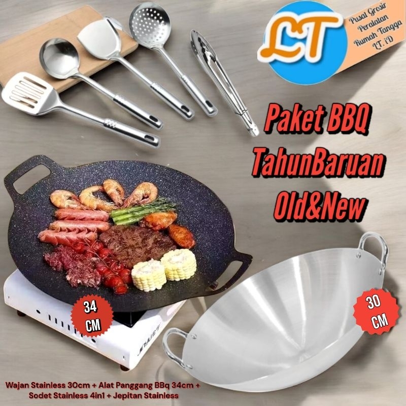 LT.ID 060 Paket BBQ TahunBaruan Alat Panggang 34cm + Jepitan + Sodet 4in1 + Wajan 30cm