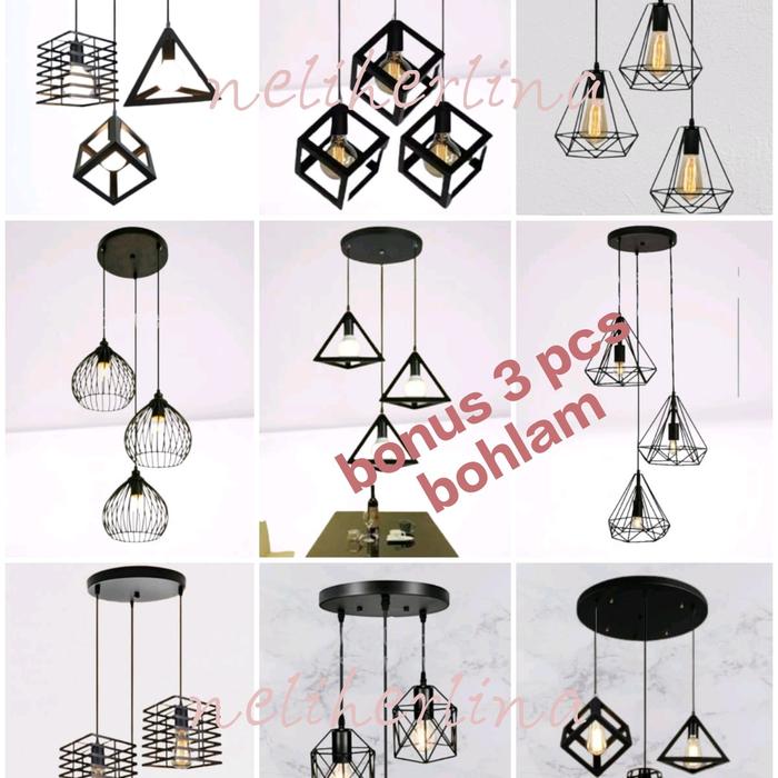 Lampu hias gantung full set+bohlam 3 Bulat - diamond kap bulat+bohlam putih 3