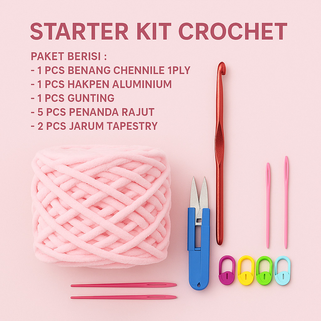 (BACA DESKRIPSI) STARTER KIT CROCHET PAKET BENANG RAJUT CHENNILE 1PLY LENGKAP