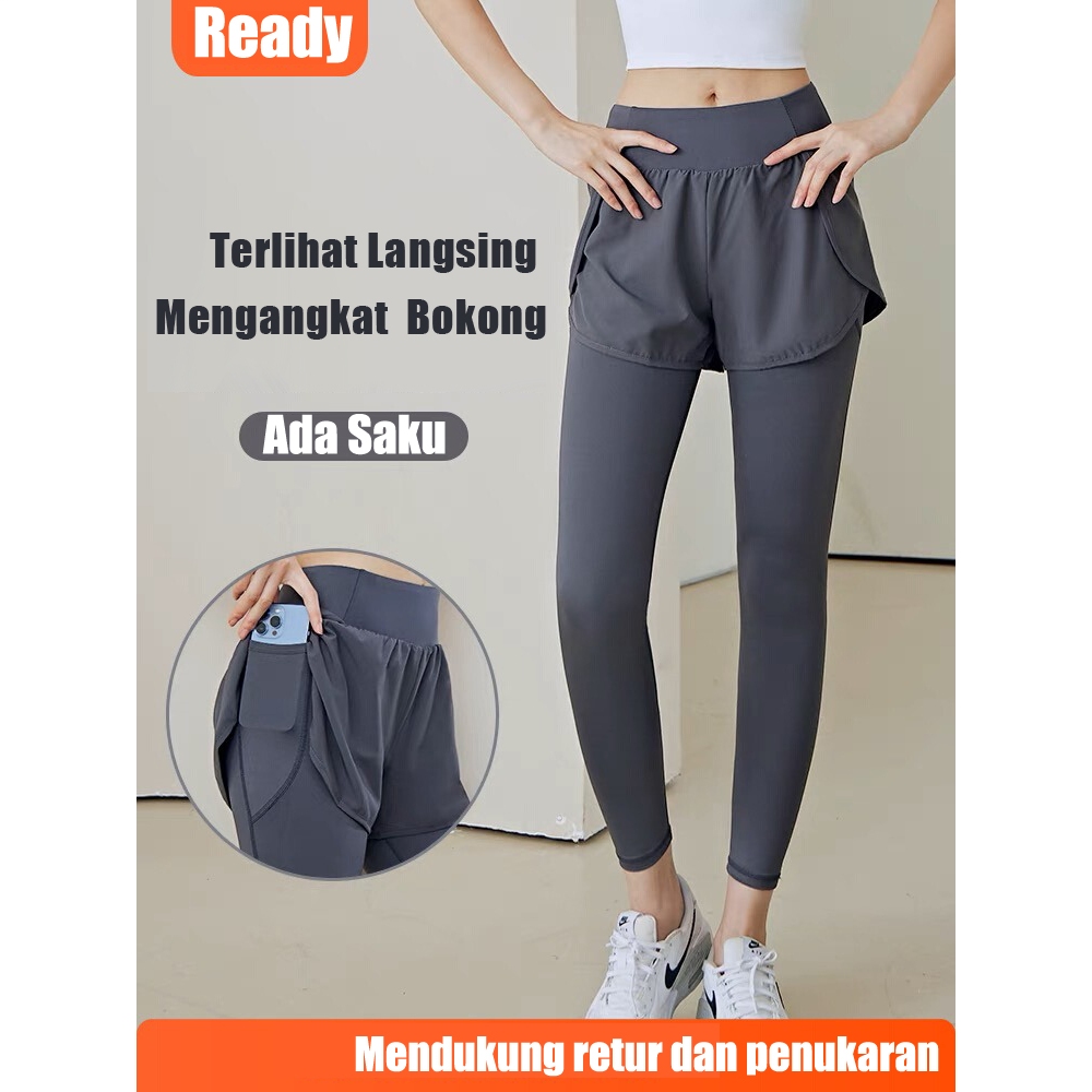 【Hapigogo】】Celana Double Olahraga Wanita Legging High Waist Yoga Pants Sport Dua Lapisan 2 in 1