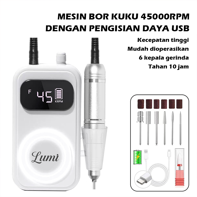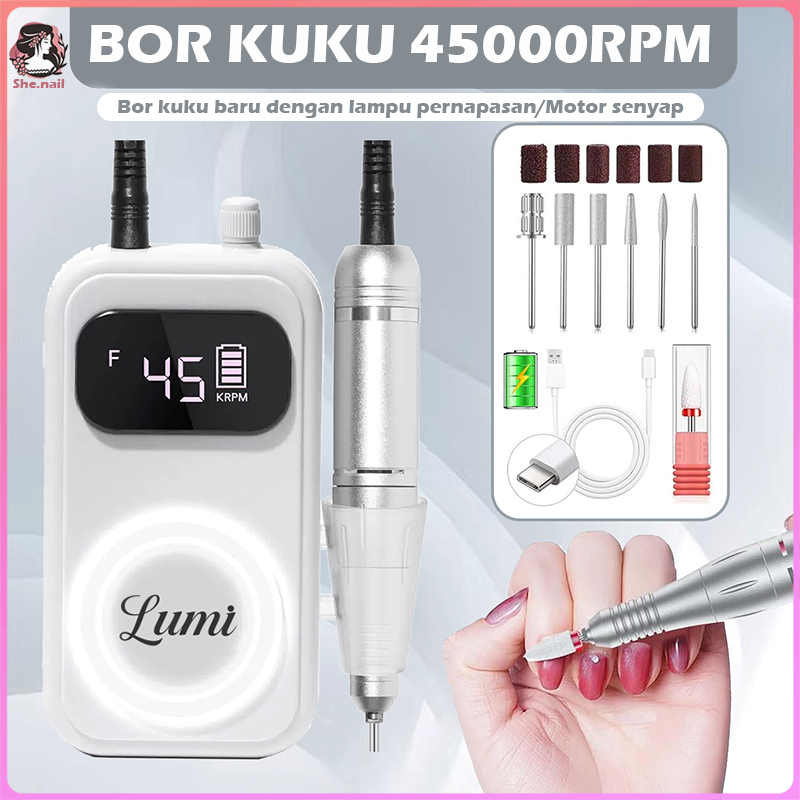 She.Nail Mesin Bor Kuku Elektrik 45000RPM, Mesin Pengasah Kuku Gel Isi Ulang untuk Penghapus Kuku dengan 6 Mata Bor