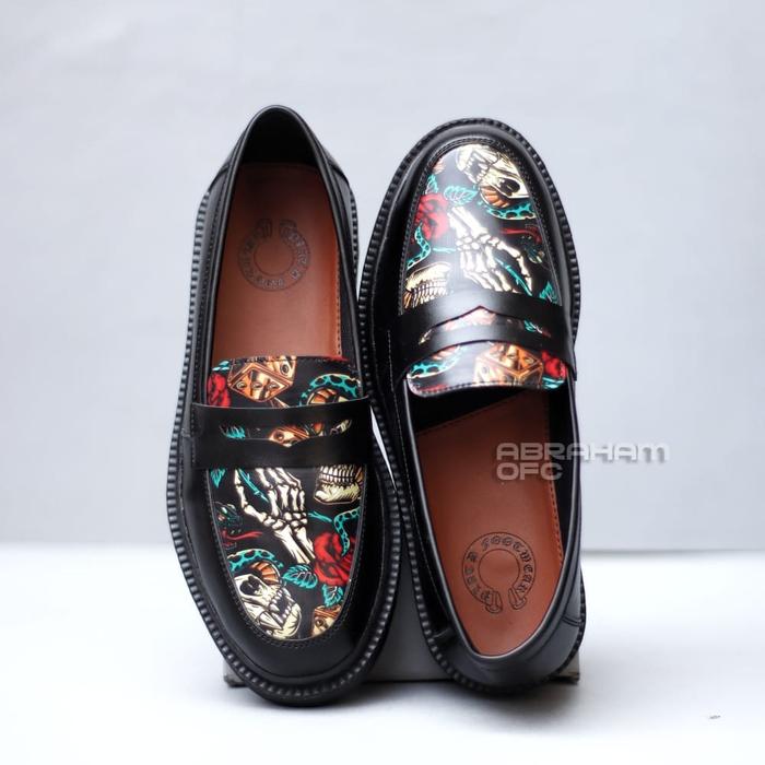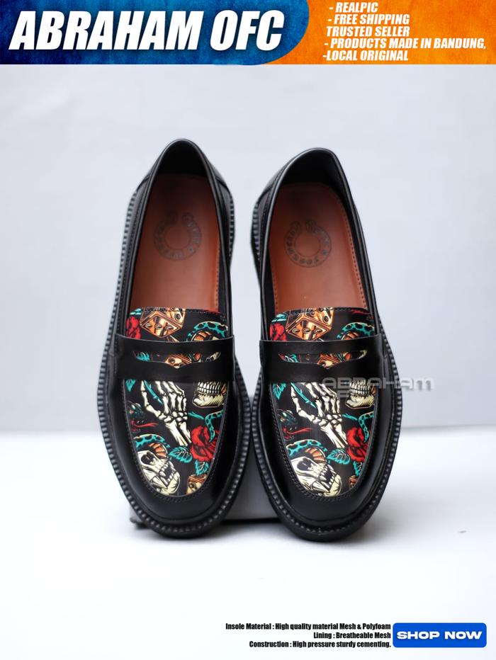 ABRAHAM SEPATU LOAFERS DOCMART PRIA PANTOFEL HITAM TRIBAL SKULL KERJA SHOES FLAT KASUAL - TRIBAL SKUL, 39