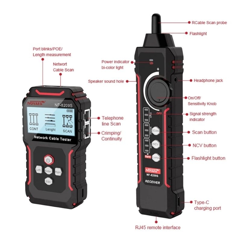 NOYAFA NF-8209S Network Cable tester Tracker CAT5 CAT6 POE Lenght Continuity Test NCV & lamp