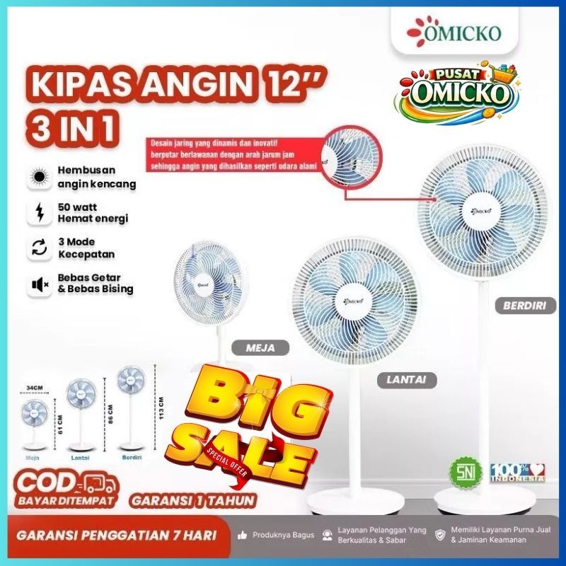 Kipas Angin Omicko 12 Inch 3in1 | Kipas Berdiri Meja Lantai | Angin Kuat | Garansi Resmi 1 Tahun