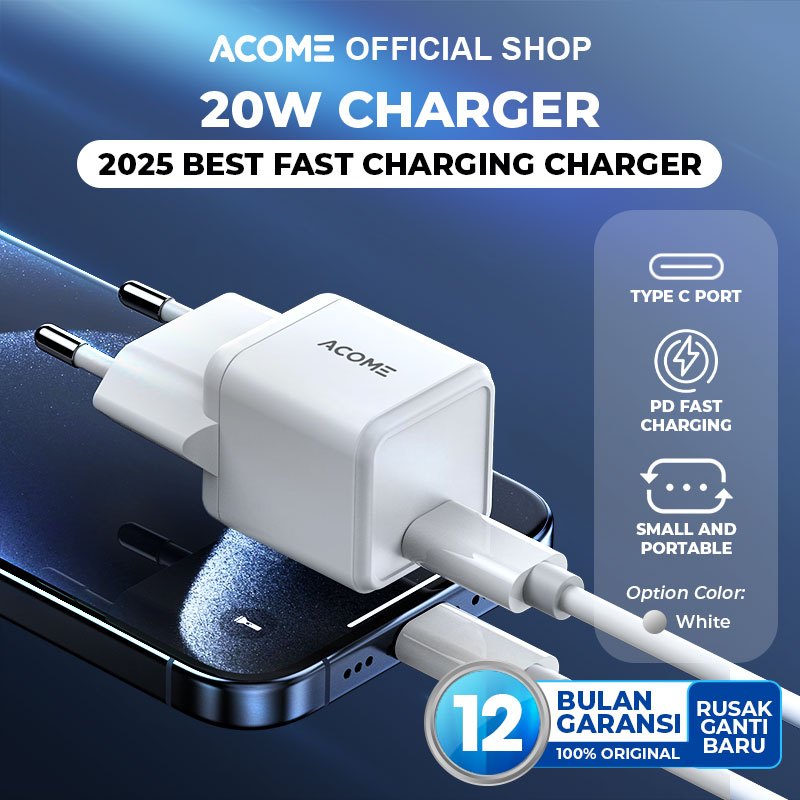 [Star] ACOME Kepala Charger Adaptor Single Port Type-C PD 20W Fast Charging iPhone 17 16 15 14 13 Samsung AC12 White