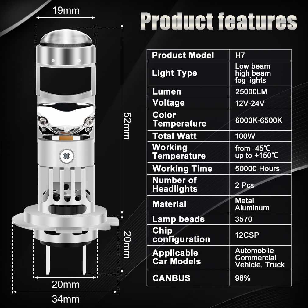 XSTORM 2pcs 100W 25000LM H7 LED Projector Car Bulb Mini Lens 1:1 Wireless Plug&Play Canbus 6500K Auto Motorcycle H7 LED