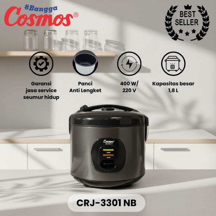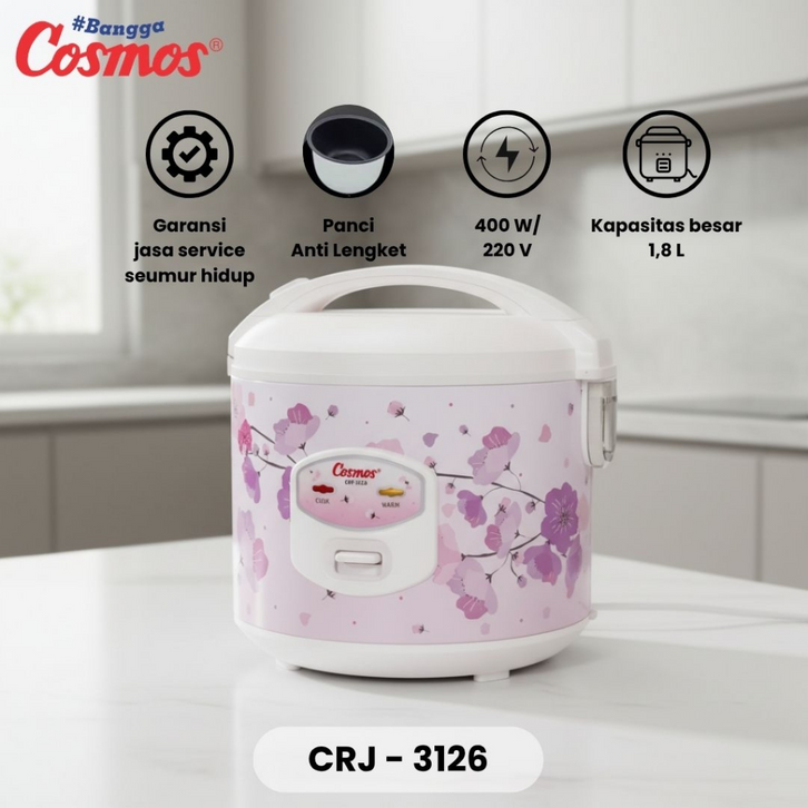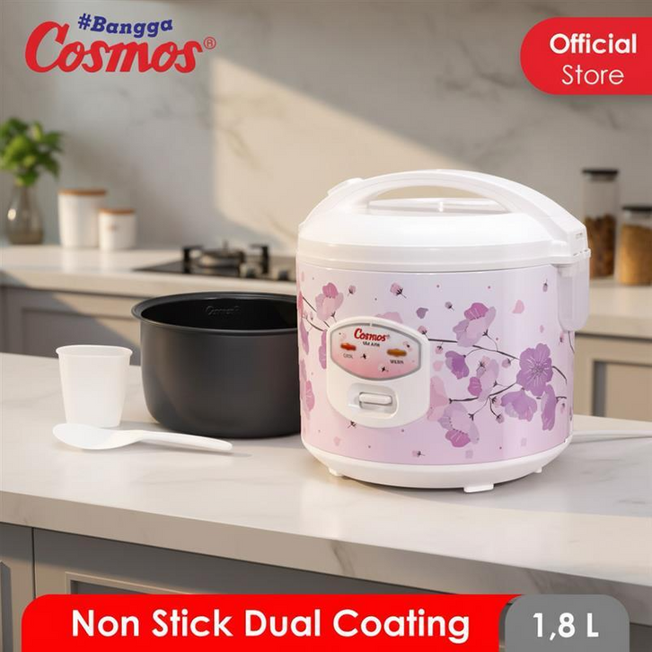 Rice Cooker Cosmos Dengan Inner Pan Non Stick Coating Yang Anti Lengket Berkapasitas 1.8 Liter.