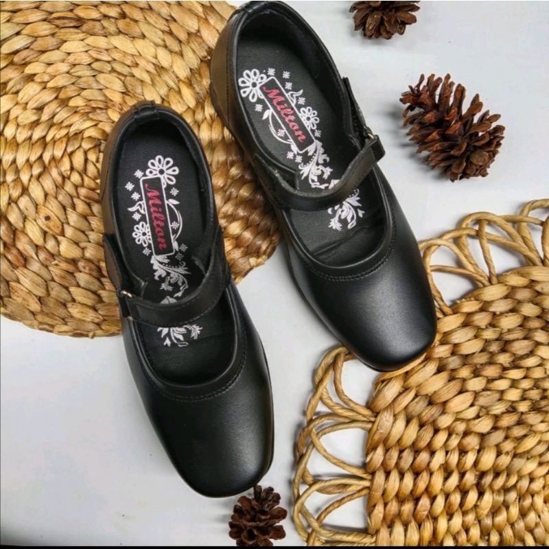 Sepatu Pantofel Cewek Wanita Wedges Hak Paskibra Sekolah Kerja Kantor Hitam Polos Milton Original Kekinian