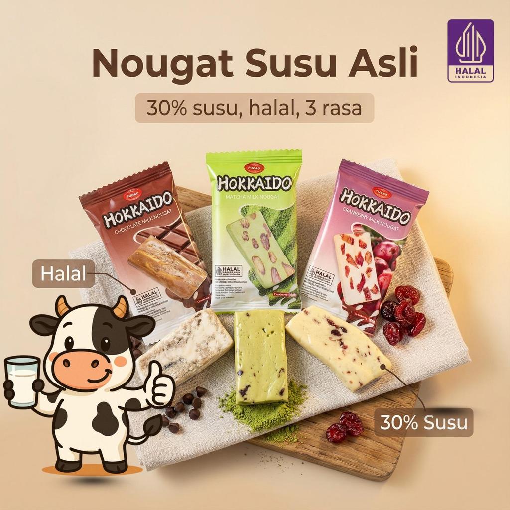 Nougat Susu Asli HOKKAIDO 25pcs – 30% Susu Sapi Segar, Halal MUI, Tekstur Lembut Tidak Lengket, 3 Rasa Favorit: Coklat,