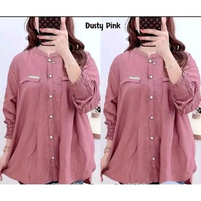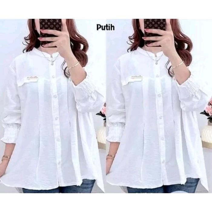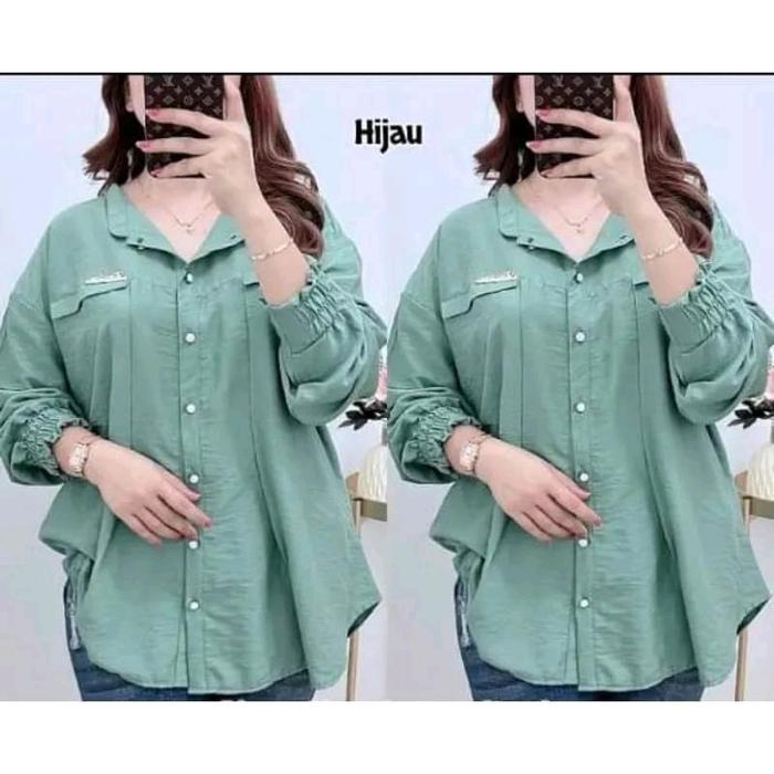 Salsa Shirt Kemeja Polo Linen Premium Atasan Wanita Jumbo Full Kancing Aktif Oversize Lengan Karet Baju Panjang Basic -