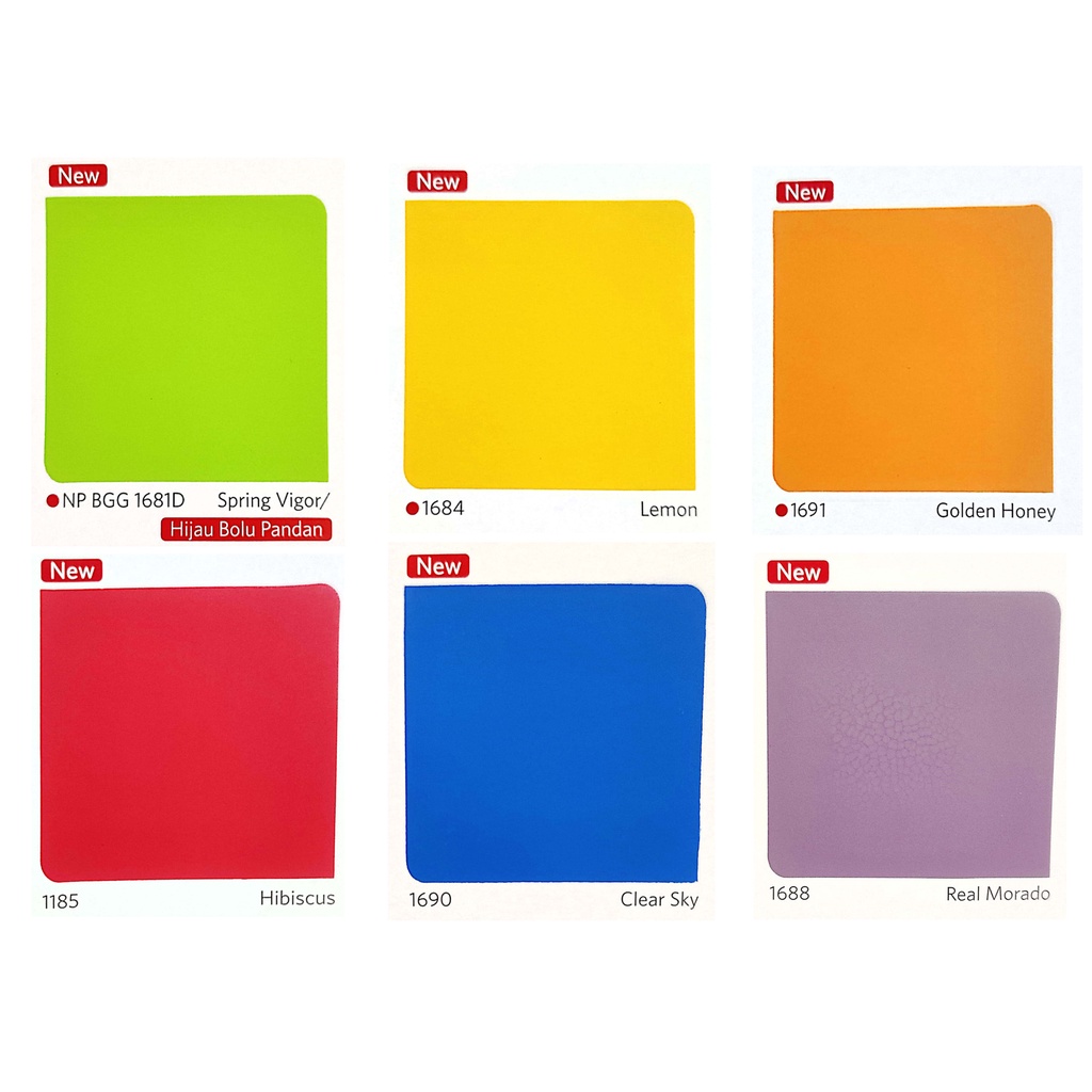 1505 - PUTIH, 1502 - BRILIANTWHITE, 1515 - BARLEY WHITE, 1509 - LILY WHITE, 1154 - HIJAU TELOR, 1546 - LIME GREEN, 1523 - VICTORIA, 1547 - SWIMMING BLUE, 1541 - ATLANTIC, 1671 - MOON GLOW, 1553 - LAVENDERPRINT, 1552 - PINK POSY, 1562 - CANDY PINK, 1557 - SUNSHINE, 1117 - IVORY, 1518 - CREAM, 1556 - CAFE LATTE, 1560 - SAND STORM, PAKET ALAT CAT, 1131 - ORANGE TORCH, 1550 - GRAYCLOTH, 1549 - COPPER GREY, 1503 - BLUE WHITE, 1657 - BRIGHT GREEN, WARNA LAIN & BARU