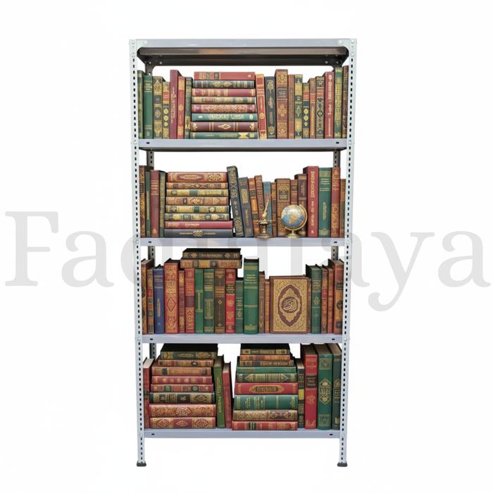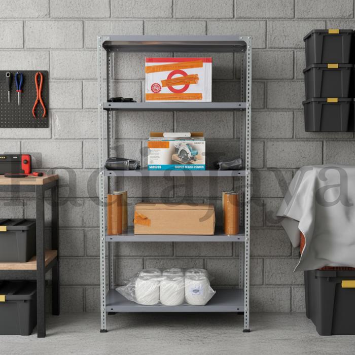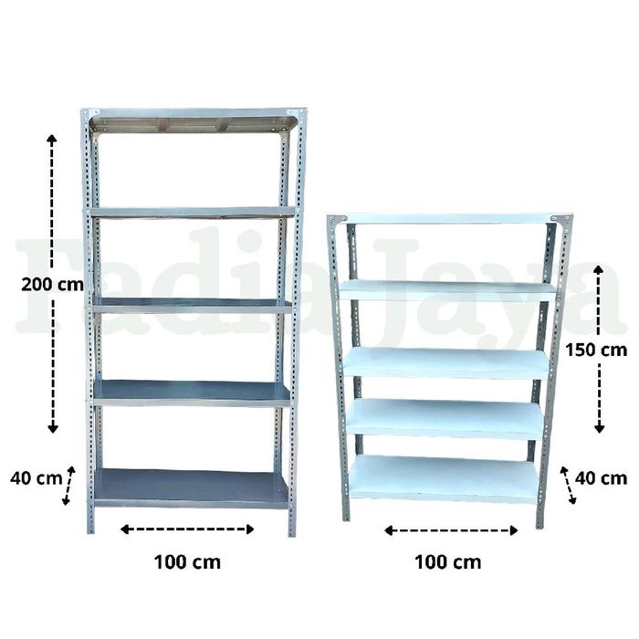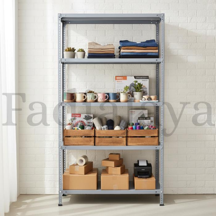Rak Ambalan Besi Siku Lubang 5 Susun Tingkat Gudang Kayu Plastik Penyimpanan Rumah Kantor Warung Warna Putih Ukuran 100X