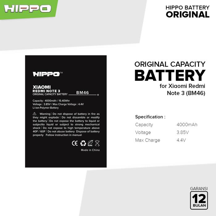Baterai Hippo For XiaoMi Redmi Note 3 / 3 Pro BM46 3950 mAh Garansi Resmi - BAT XIO BM46