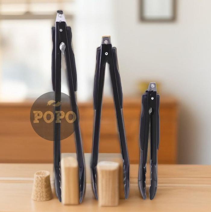 Murah Jepitan Capitan Tongs Stainless Hitam Roti Kue Daging BBQ Serbaguna - S Hemat