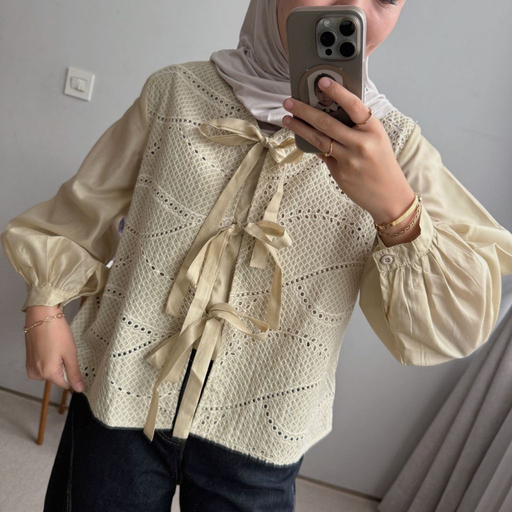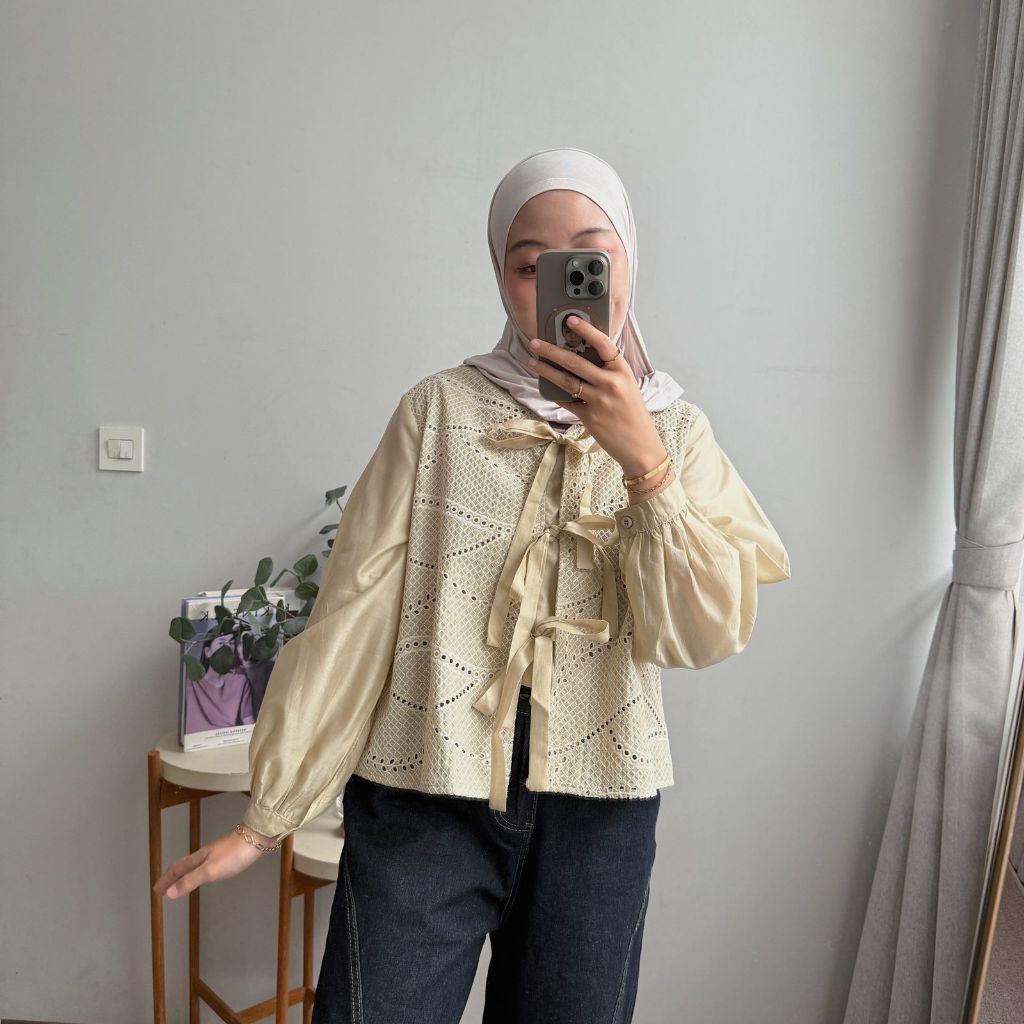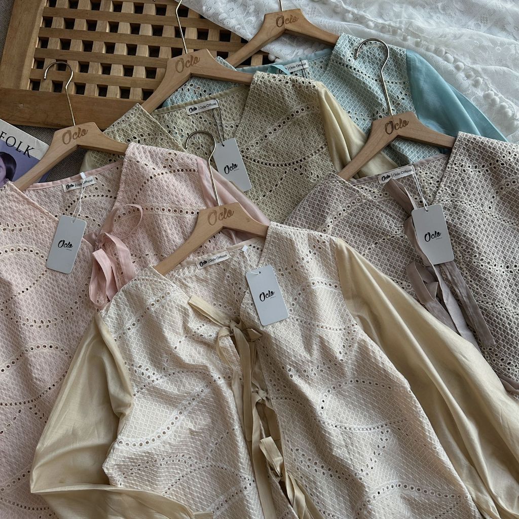 Oclo Maylani Outer Bordir Casual Basic Atasan Blouse Wanita Katun Linen Bunga Tali Pita Lengan Panjang OCL02557