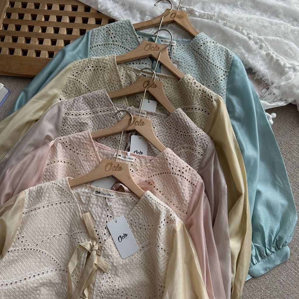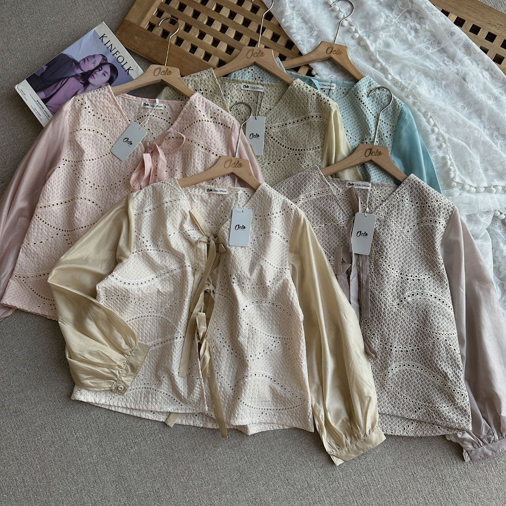Oclo Maylani Outer Bordir Casual Basic Atasan Blouse Wanita Katun Linen Bunga Tali Pita Lengan Panjang OCL02557