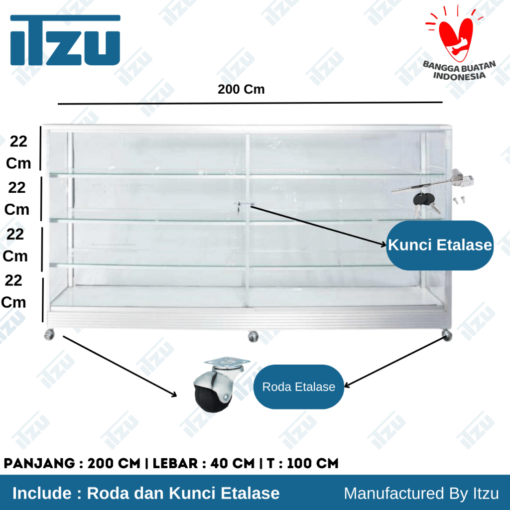 Etalase Kaca Alumunium 200 Cm / Etalase Kaca Jualan 200 Cm Dengan Roda Dan Kunci