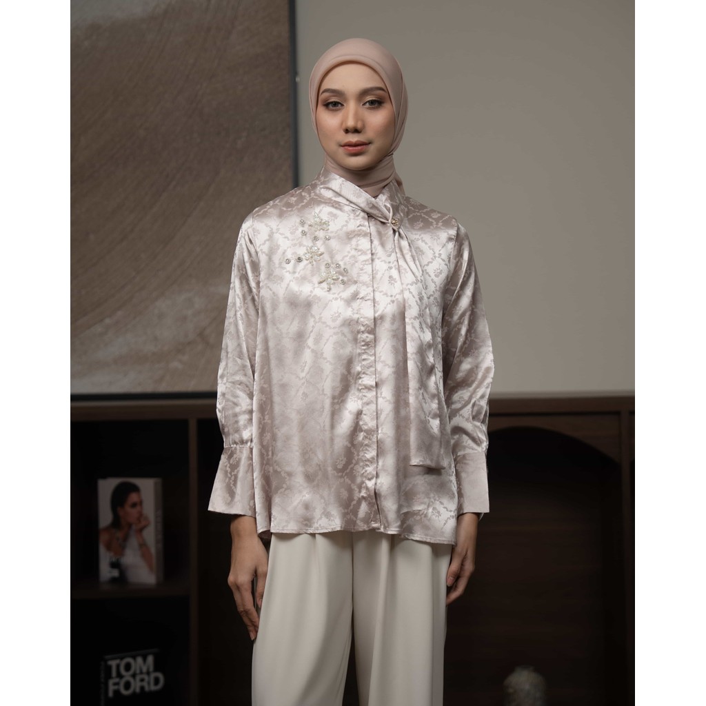 Mayoutfit Cassy Shirt Blus Wanita Atasan Baju Kondangan Kemeja Silk Aksen Payet Beads Kerah Pita Dasi