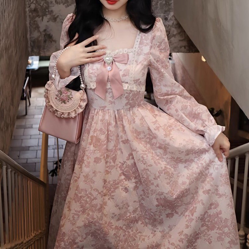 DRESS WANITA KOREA DRESS PESTA NATAL SIMPLE GAUN WANITA KOREAN STYLE DRESS PANJANG MOTIF BUNGA PINK LONG DRESS KOREA