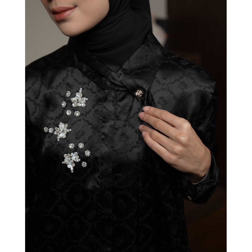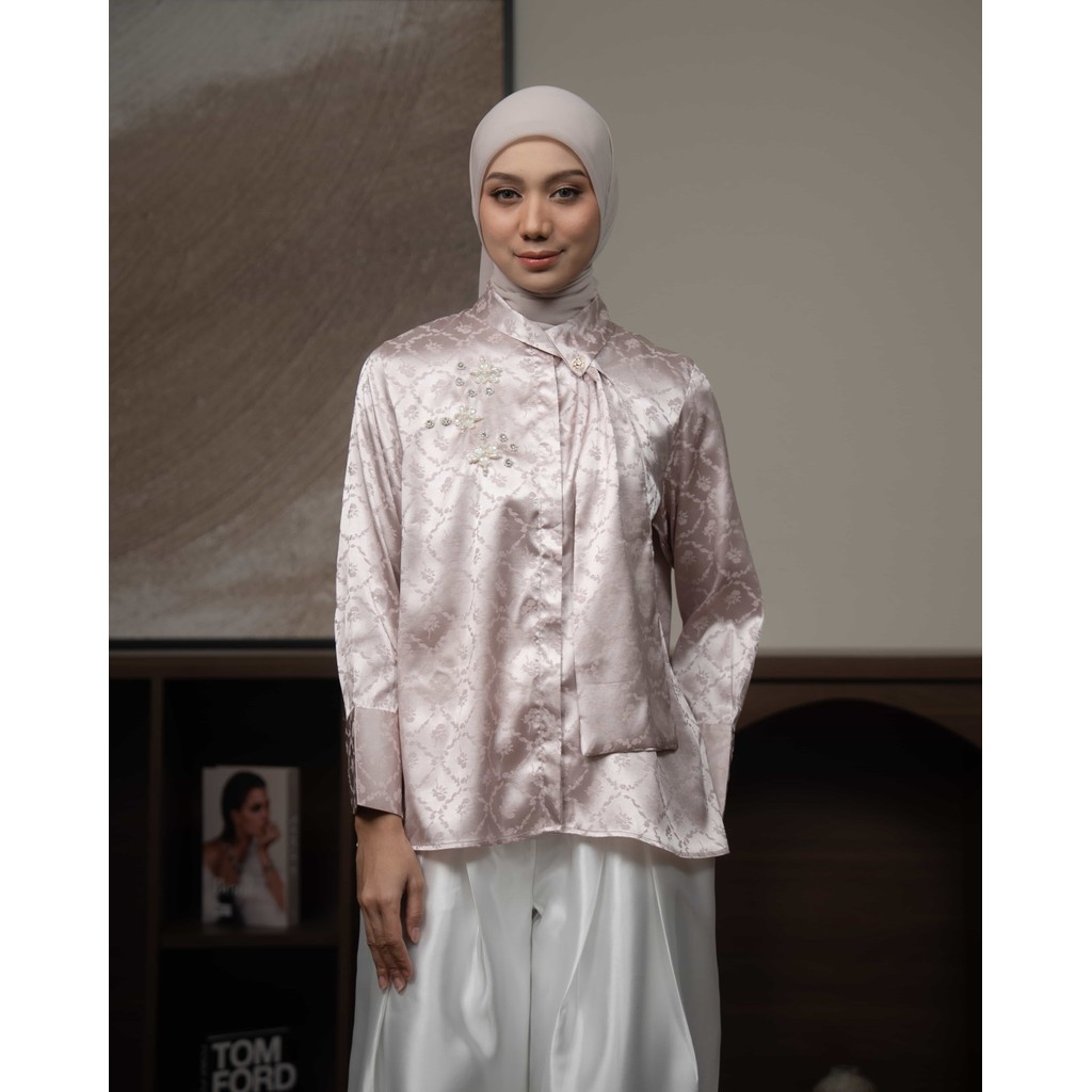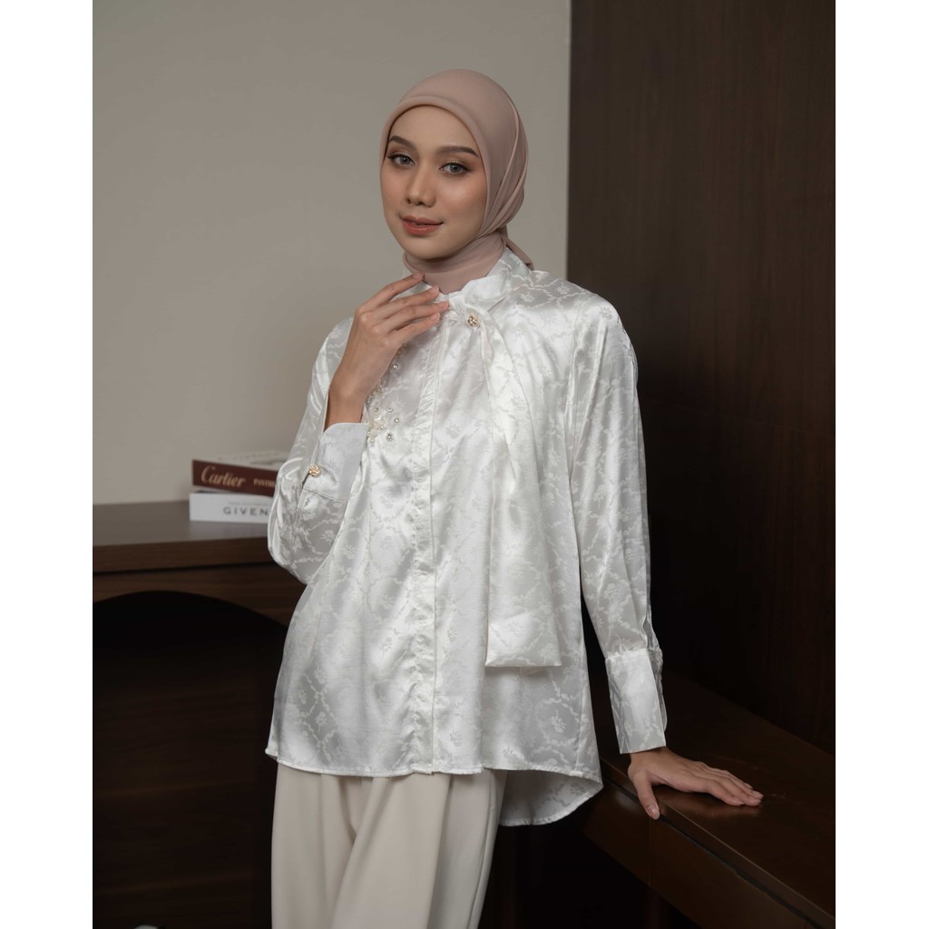 Mayoutfit Cassy Shirt Blus Wanita Atasan Baju Kondangan Kemeja Silk Aksen Payet Beads Kerah Pita Dasi