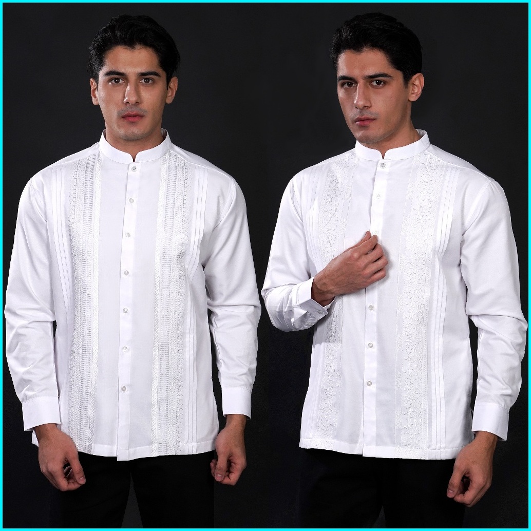 Casella Baju Koko Pria Lengan Panjang Pleats Embroidery Baju Koko Putih Lengan Panjang