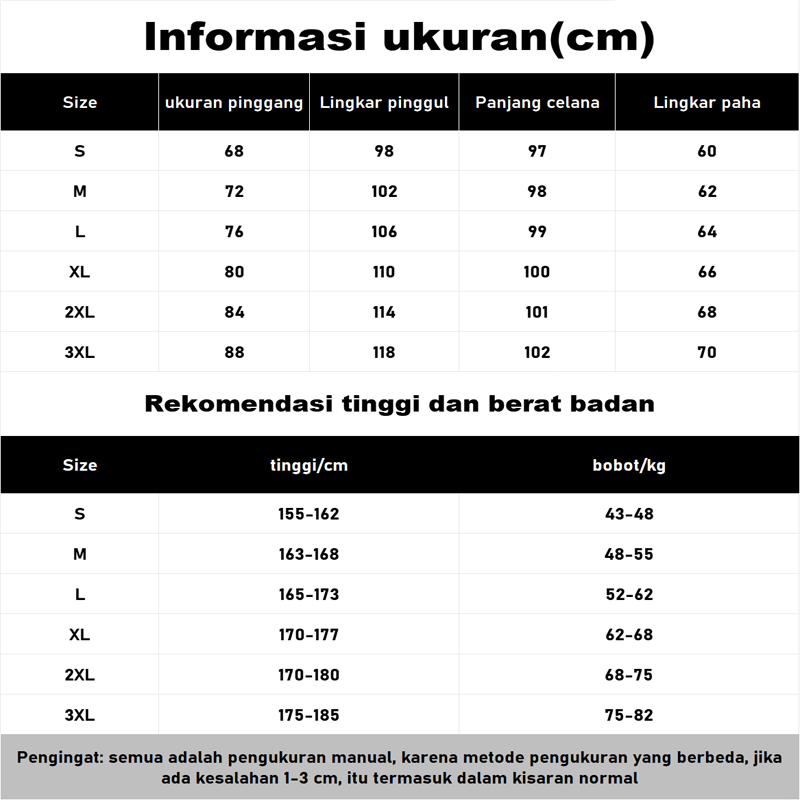 S cocok(BB43-48KG), M cocok(BB48-55KG), L cocok(BB52-62KG), XL cocok(BB62-68KG), 2XL cocok(BB68-75KG), 3XL cocok(BB75-82KG)