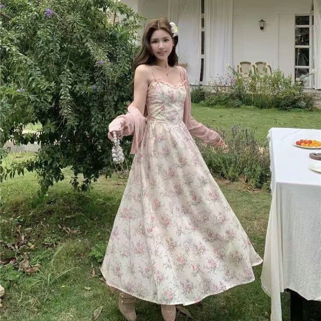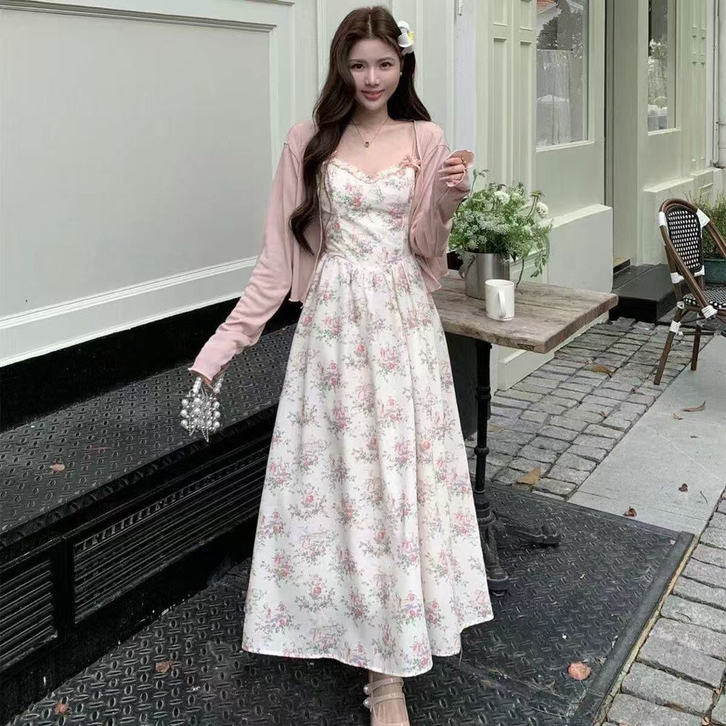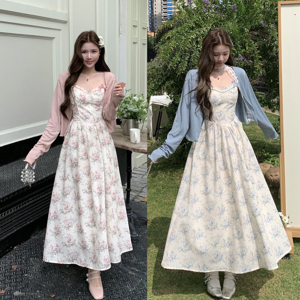Dress Wanita Korea Midi Dress Elegan Mewah Kekinian Setelan Long Dress Suspender Manis + Cardigan || Dress Bunga Motif