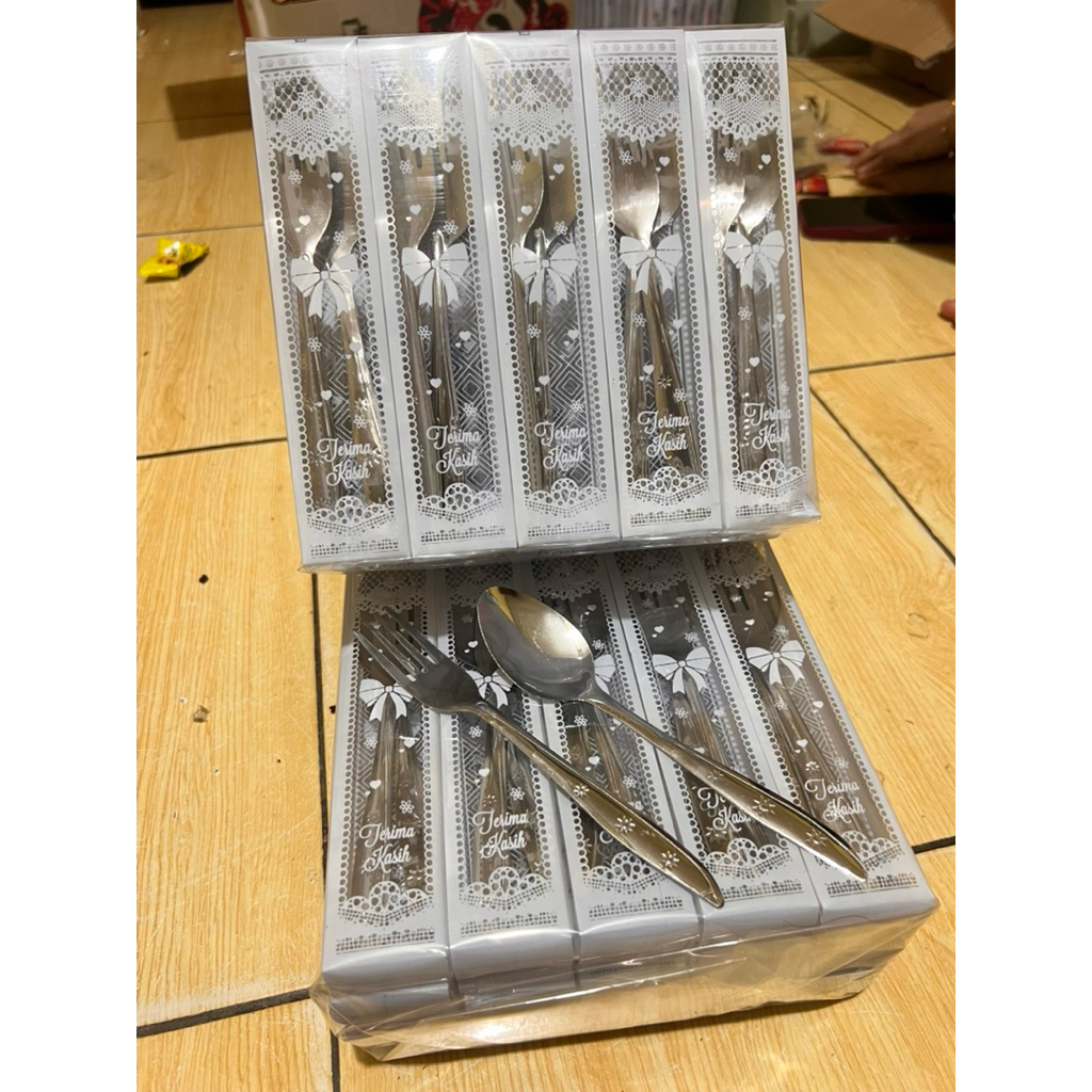 SOUVENIR ( 25pcs )SENDOK GARPU TRANSPARAN SETENLIS GAGANG BINTANG / SEGI Kkuningan mengkilap MIKA MOTIF