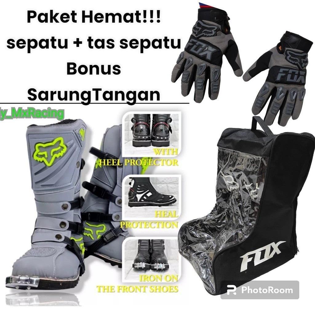 TERMURAH paket hemat sepatu cross trail ujung besi plus tas jingjing buat sepatu bonus sarung tangan boots fx grey fou