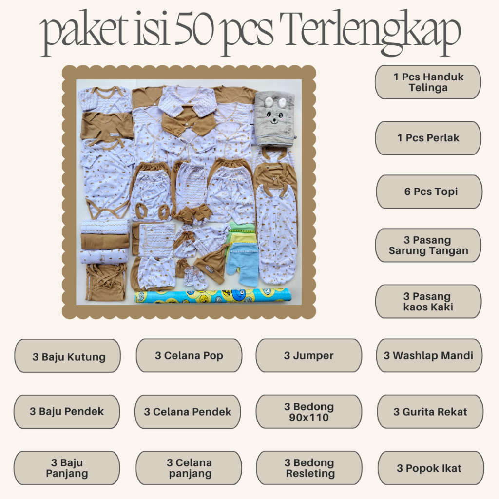 Paket Brojol Terlengkap 50 Pcs Perlengkapan Baju Celana Bayi Baru Lahir Laki-Laki Perempuan Hemat
