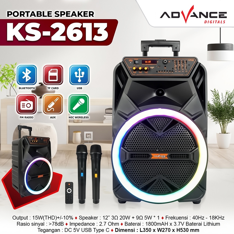 Advance 12" KS2613 Speaker Bluetooth Portable Free 2 Microphone Wireless Garansi Resmi 1 Tahun