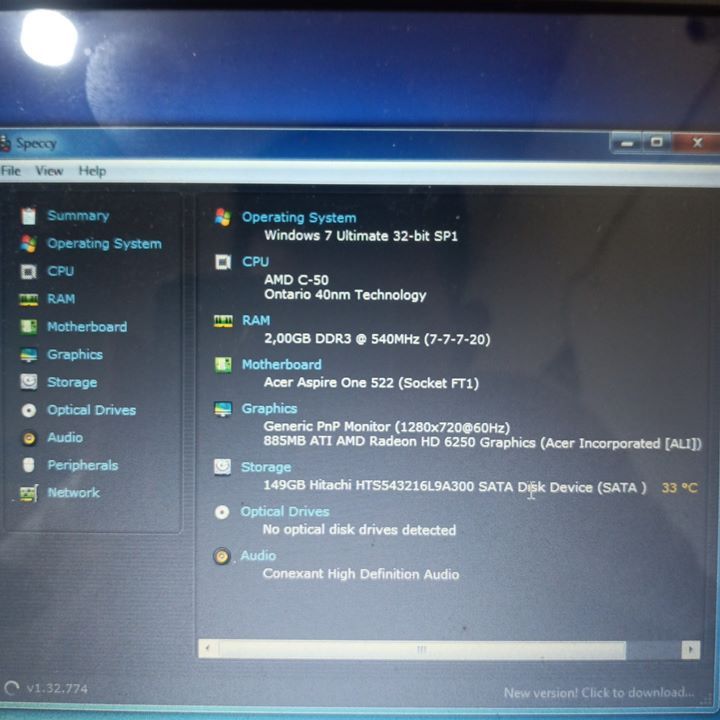 Notebook Acer Aspire One 522 RAM 2GB HDD 160GB AMD C-50 Windows 7 Second Bekas