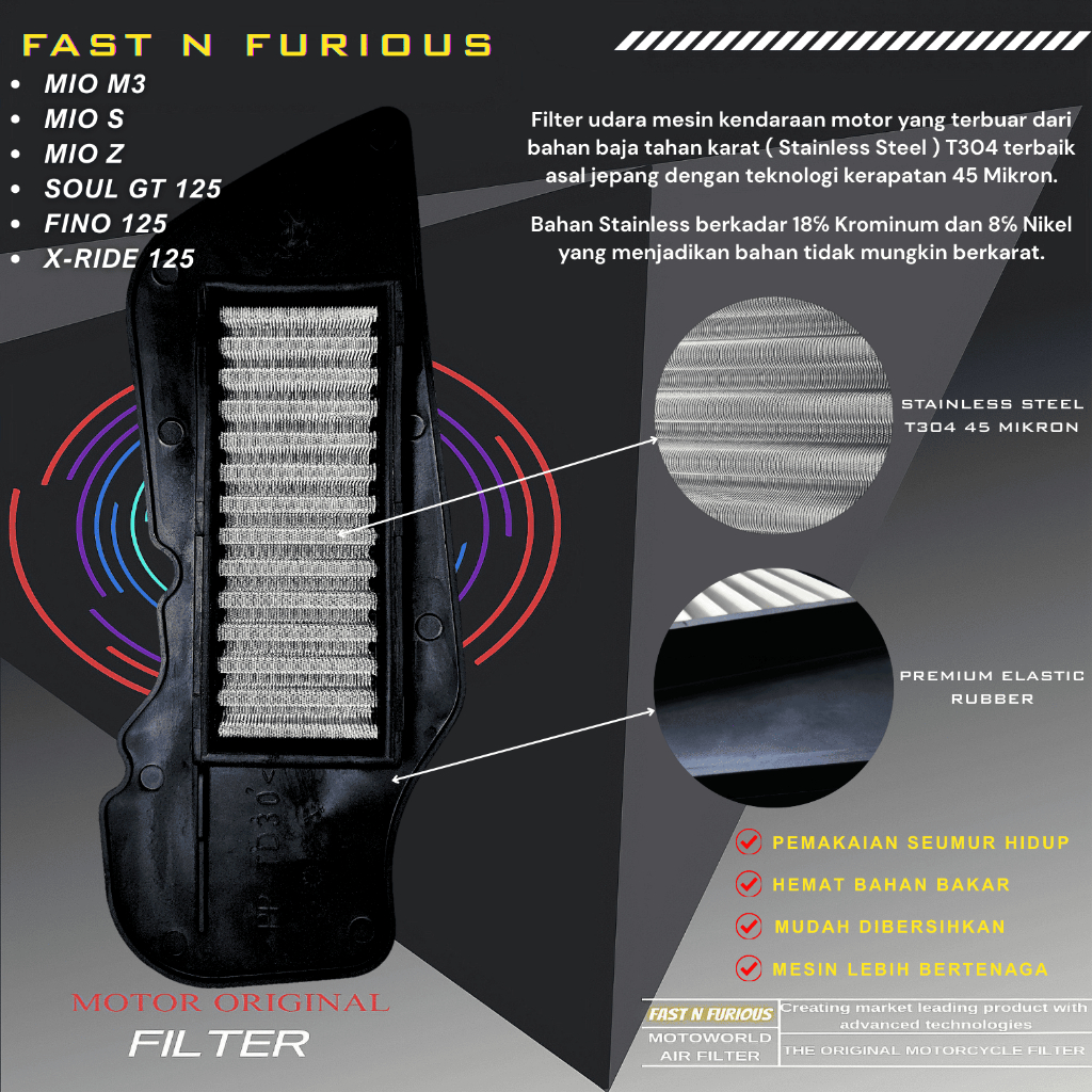 Filter Udara Stainless Saringan Udara Mio M3 Mio S Mio Z Soul Gt 125 Fino 125 Xride 125 Original Fast N Furious