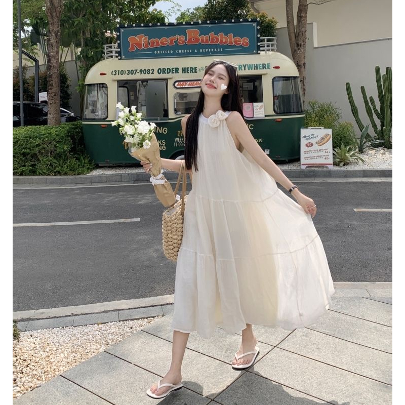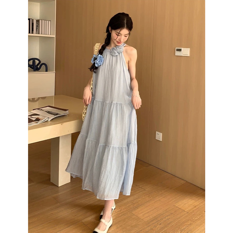 Dress Wanita Korean Gaun Bunga Tiga Dimensi Baru Yang Lembut Untuk Liburan, Gaun Pantai Gaun Panjang Dopamin Ramping