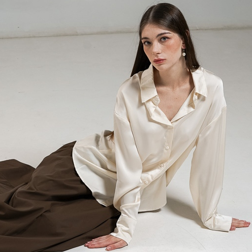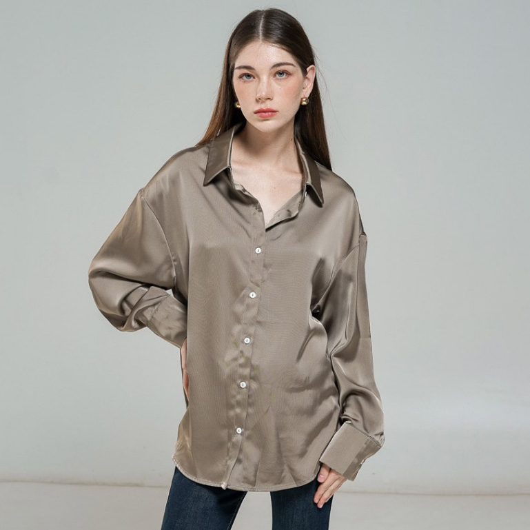 This Is April Siena Top Atasan Wanita Kekinian Satin Silk Hijap Friendly Lengan Panjang Ivory dan Olive Formal Look