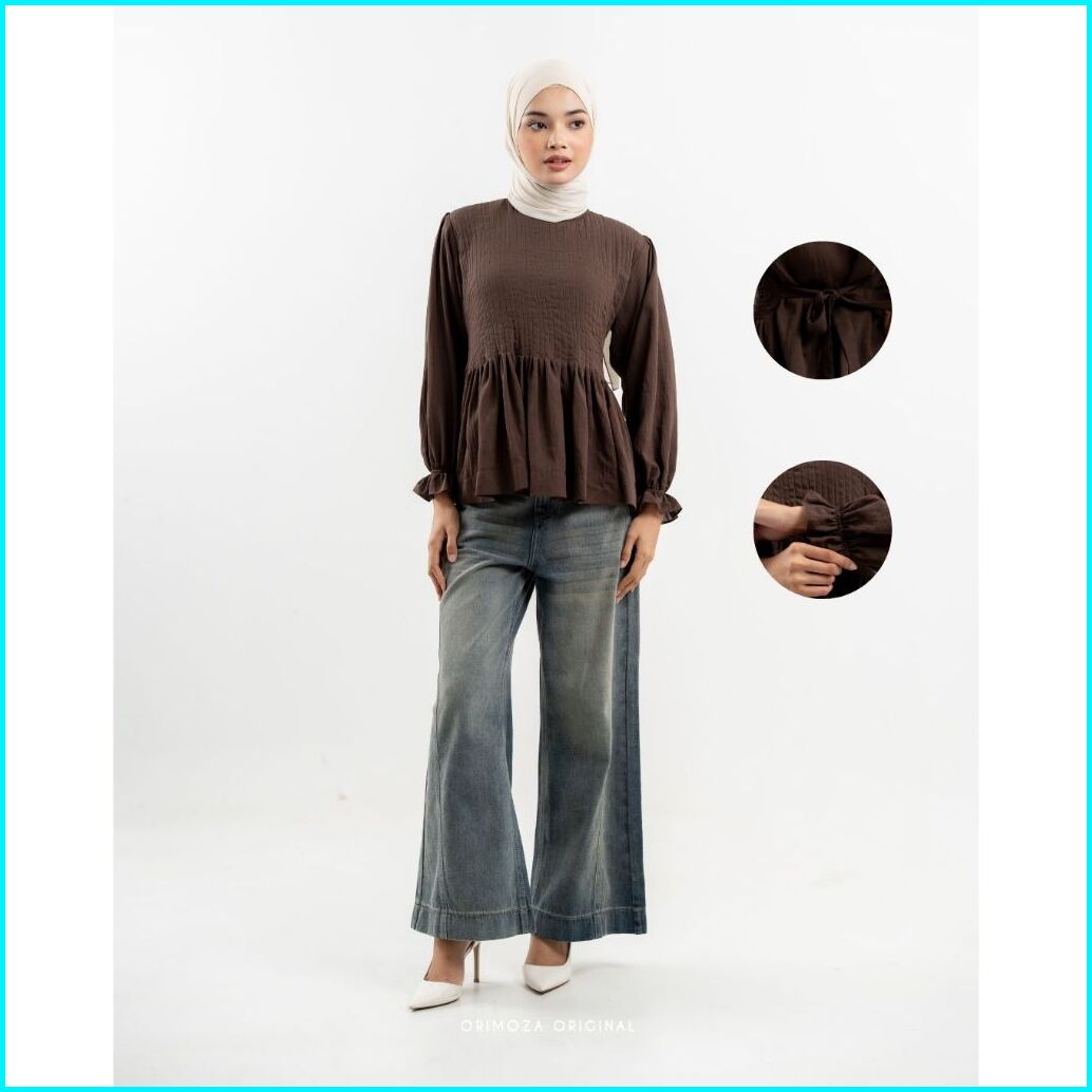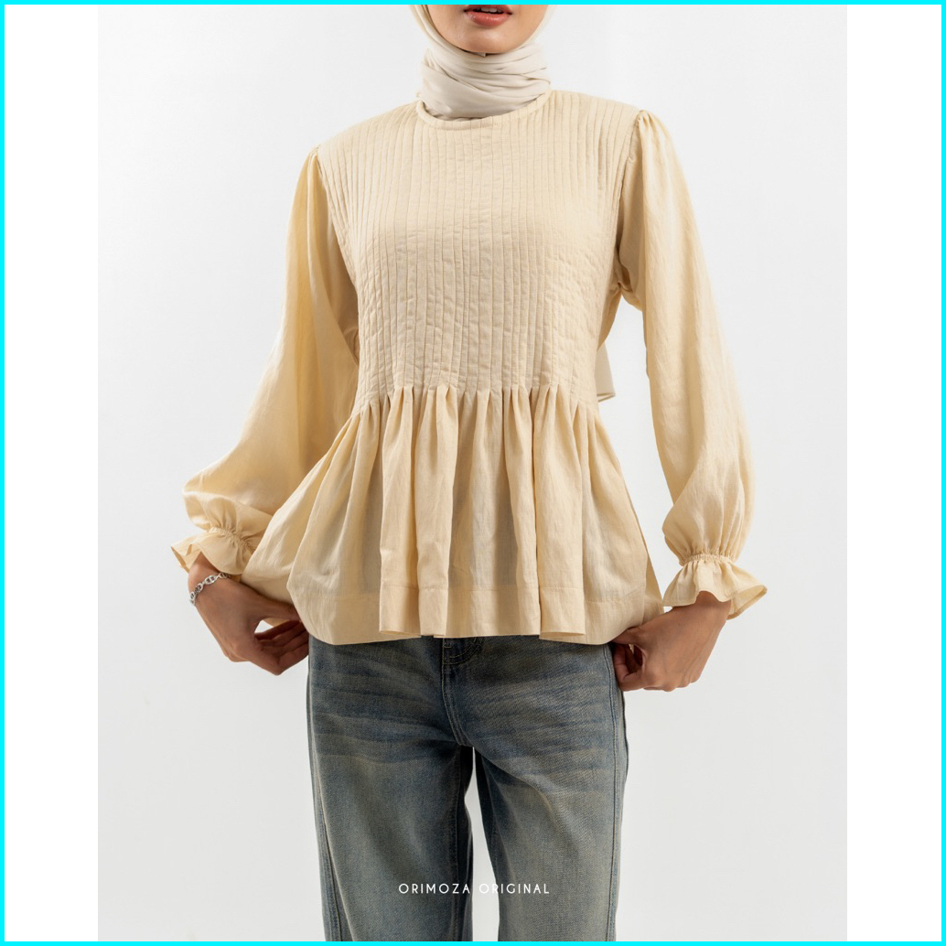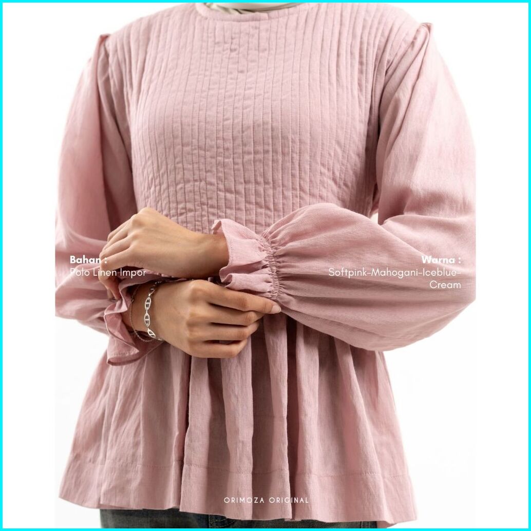 Orimoza Peony Pleats Blouse Korean Ballon Sleeve Polo Linen Impor
