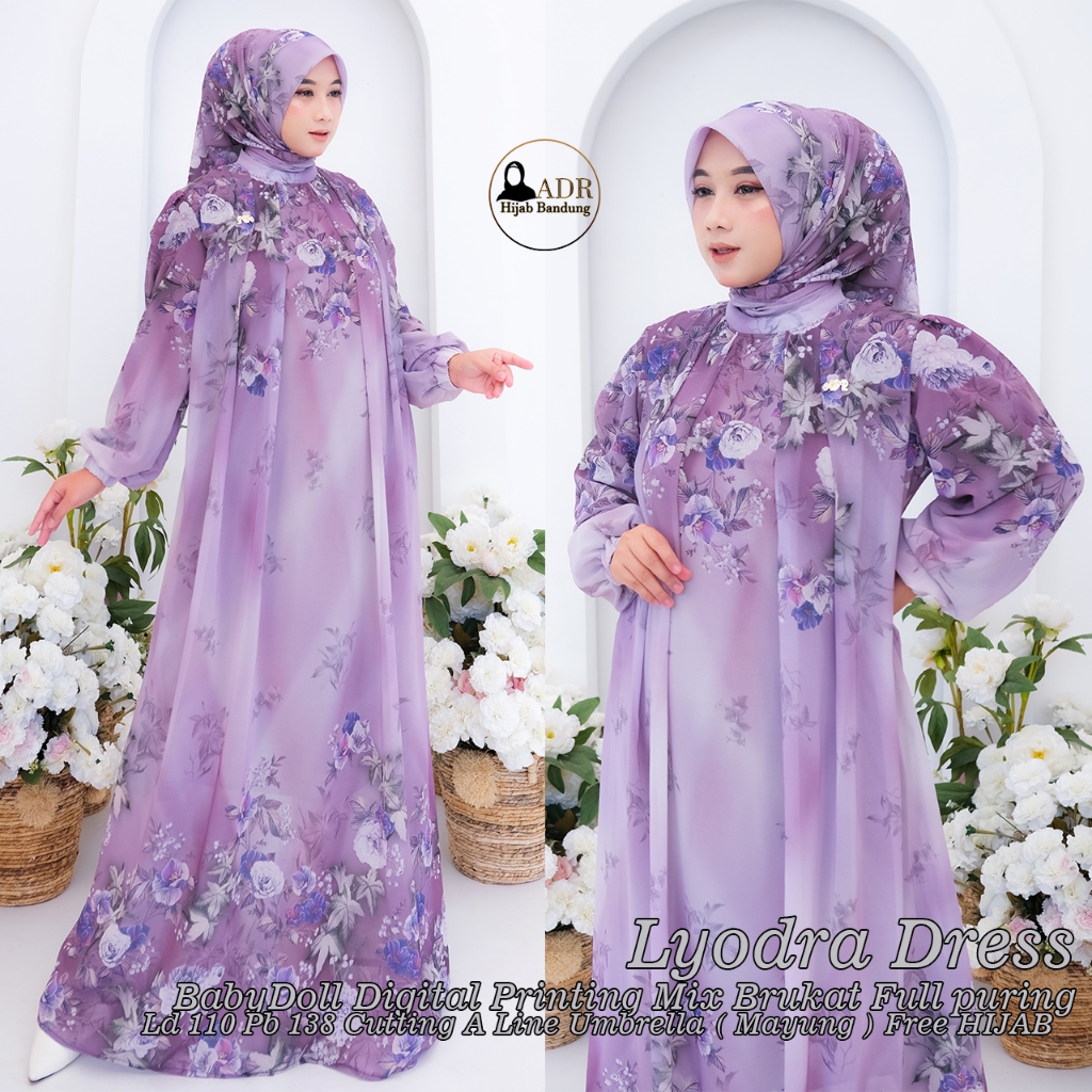 Dress Lyodra Gamis BabyDoll Digital Printing Full Furing dan Wudhu Free Hijab Muslim